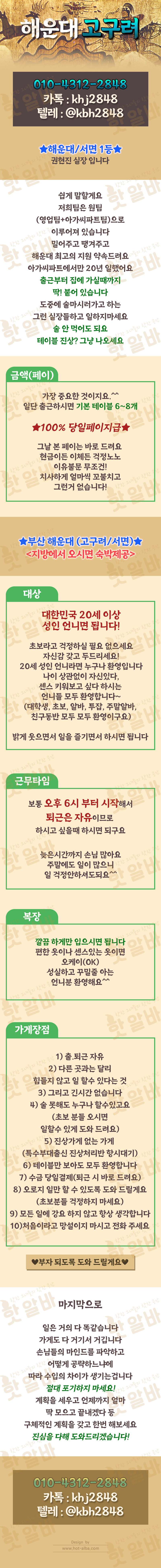 업종 | 룸싸롱 | 근무지역 | 부산 - 해운대구 , 부산 - 부산진구 , 울산 - 남구 |